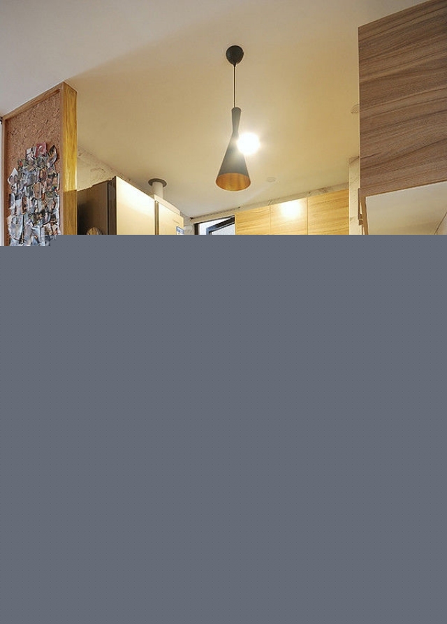 開(kāi)放式小廚房,原木紋理在昏黃的燈光的照射下,覺(jué)得暖暖的。