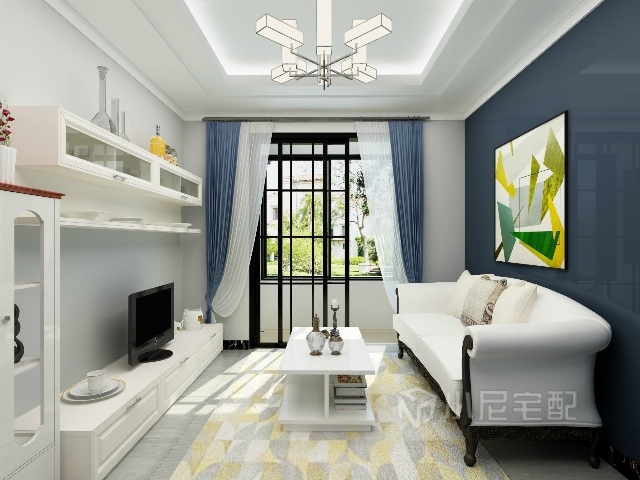 用藍(lán)色和黃色作為配色,白色的家具,簡潔的軟裝,打造時(shí)尚簡約的客廳空間。