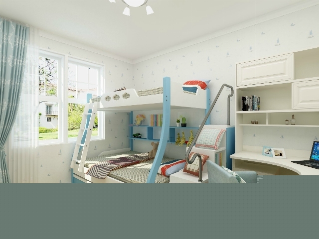 藍色的高低兒童床,轉角書桌,適合活潑好動的孩子。