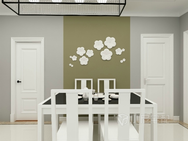 墨綠色的背景墻,白色的梅花裝飾,大方優雅。