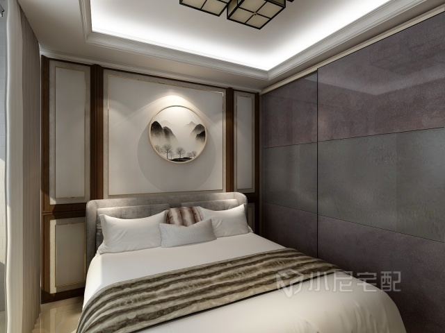 空間有限所以選擇推拉門衣柜,主臥背景墻、掛畫、吸頂燈將中式風格體現的淋漓盡致。