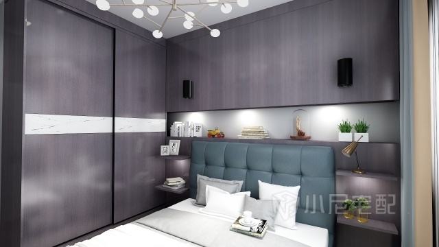 次臥辦公,休息,收納于一室,讓每一寸空間物盡其用。單區(qū)間的圍合空間,采用立體式環(huán)抱包圍,在風(fēng)水上叫藏風(fēng)聚氣